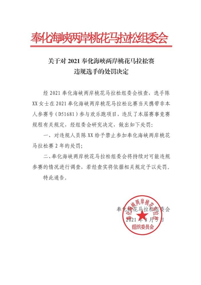 关于对2021奉化海峡两岸桃花马拉松赛违规选手的处罚决定